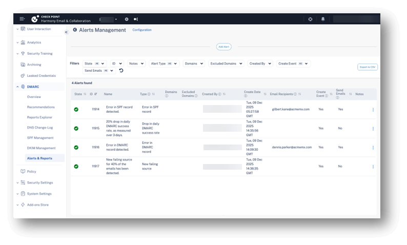 With this release, Avanan sends timely alerts for significant DMARC events via both email notifications and security events. These security events can be forwarded or ingested by SIEM platforms and accessed through APIs, enabling automation and correlation with broader security telemetry. Supported alert conditions include: