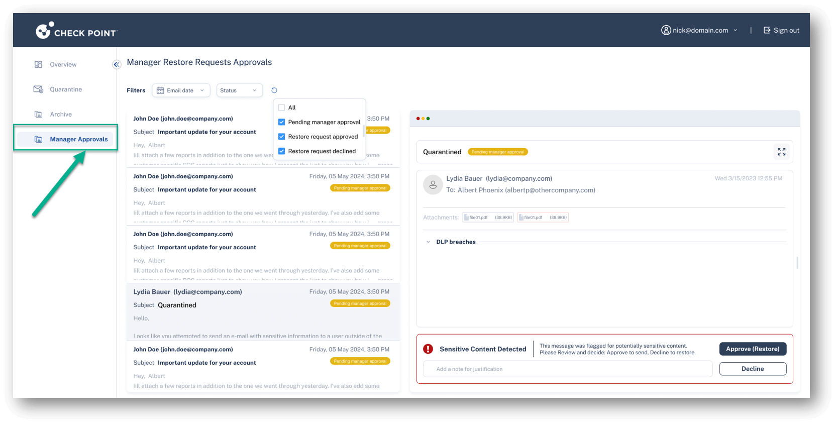 Managers approve or decline restore requests directly from their end-user portal - the same interface they already use to manage their own quarantined items and restore requests - ensuring a seamless and familiar experience.